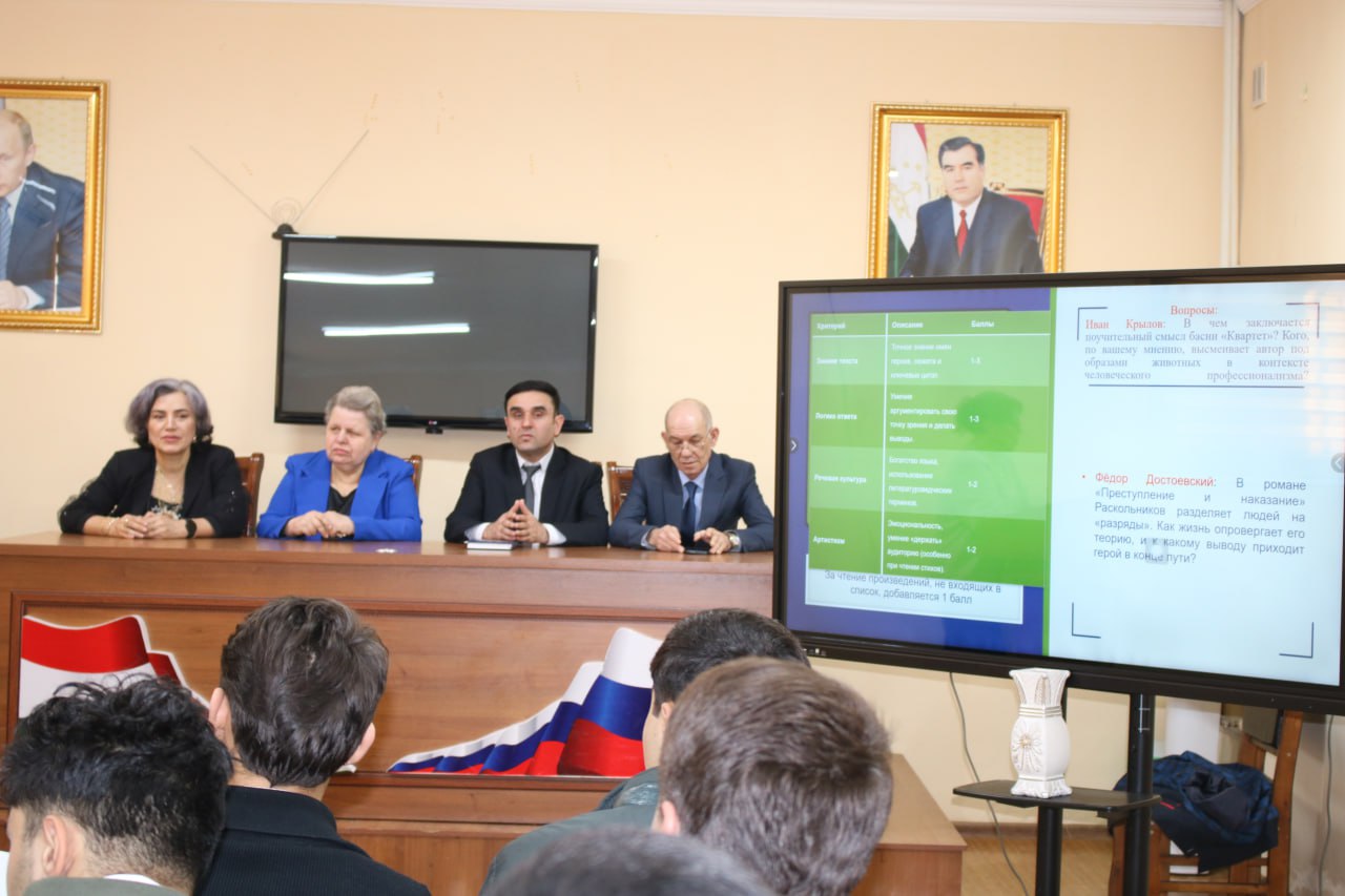 В филиале прошёл внутривузовский тур Республиканского конкурса «Фуруги субхи донои китоб аст» Контент страницы20 февраля в нашем вузе состоялся внутривузовский тур Республиканского конкурса «Фуруги субхи донои китоб аст» («Книга - мудрости зари сиянье»). Мероприятие открыл первый заместитель директора Гадоев Сафарали. Он отметил, что в этом году, как и в прошлые годы, под эгидой Основателя мира и национального единства – Лидера нации, Президента Республики Таджикистан уважаемого Эмомали Рахмона, с целью повышения интереса к чтению, укрепления интеллектуального потенциала, поиска новых ораторов и мастеров слова, почитания национальных и культурных ценностей, развития творческих способностей, укрепления чувства самосознания, совершенствования словарного запаса и содействия развитию духовного мира проводится Республиканский конкурс «Фуруги субхи донои китоб аст». Преподаватели кафедры СГН подготовили вопросы по всем заданным разделам конкурса. В соревновании приняли участие студенты всех курсов и преподаватели филиала. По итогам конкурса 1 место присуждено студенту второго курса Бердыеву Эхсону, 2 место – студенту первого курса Амирову Амиру.Конкурс направлен на развитие знаний и умений, а также популяризацию культуры и литературы среди обучающихся. Все участники смогли продемонстрировать свои способности и проявить эрудицию.Организаторы выражают благодарность всем, кто принял участие и приглашают студентов и преподавателей к активному участию в дальнейших этапах конкурса.